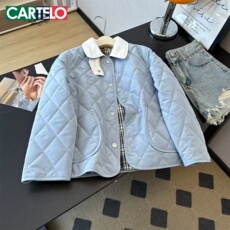 蓝色菱格加厚短款保暖棉服棉衣夹棉外套女士洋气小棉袄小个子